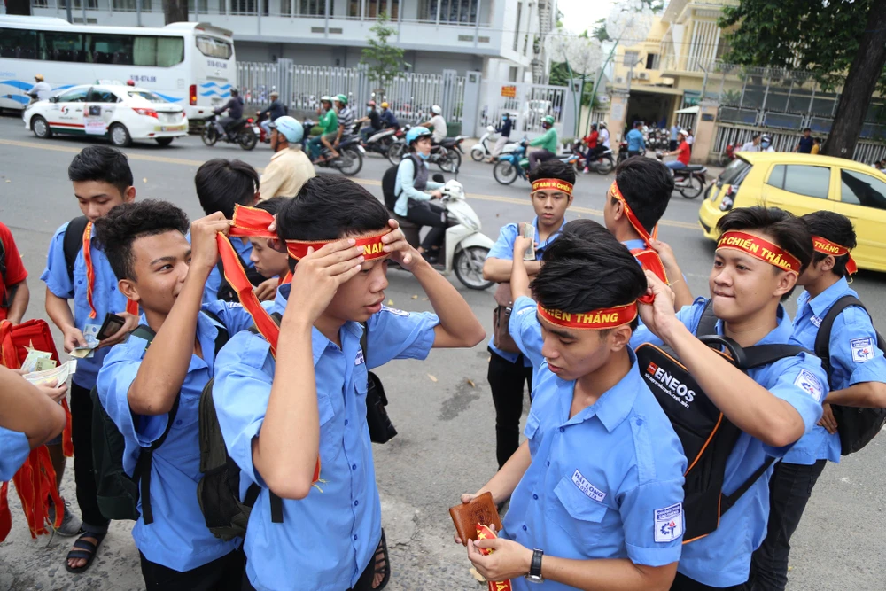 Các bạn sinh viên đang theo dõi trận bóng tại hội trường A trường ĐH Sư phạm KT TP.HCM