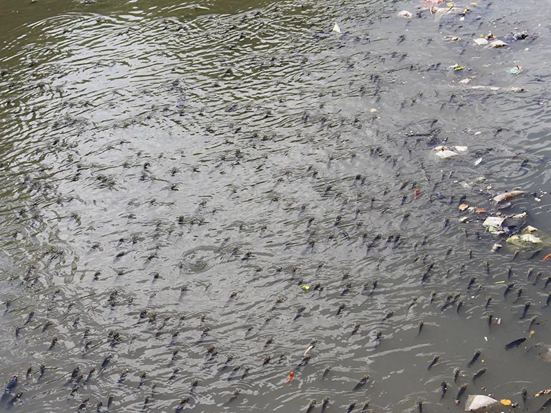 Cá ngoi lên đớp không khí sau những trận mưa liên tục mấy ngày qua.