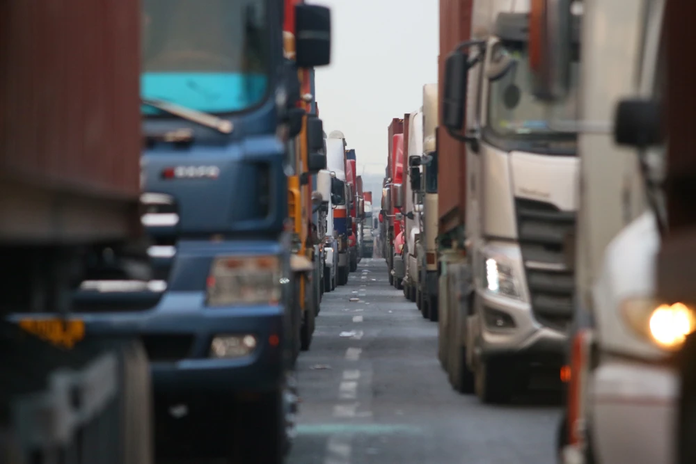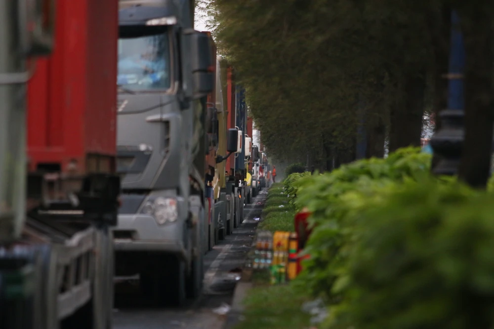 Container, xe tải phải đợi chờ hàng giờ đồng hồ để được di chuyển. Ảnh: ĐT.