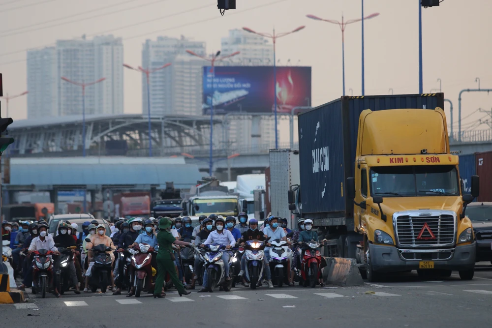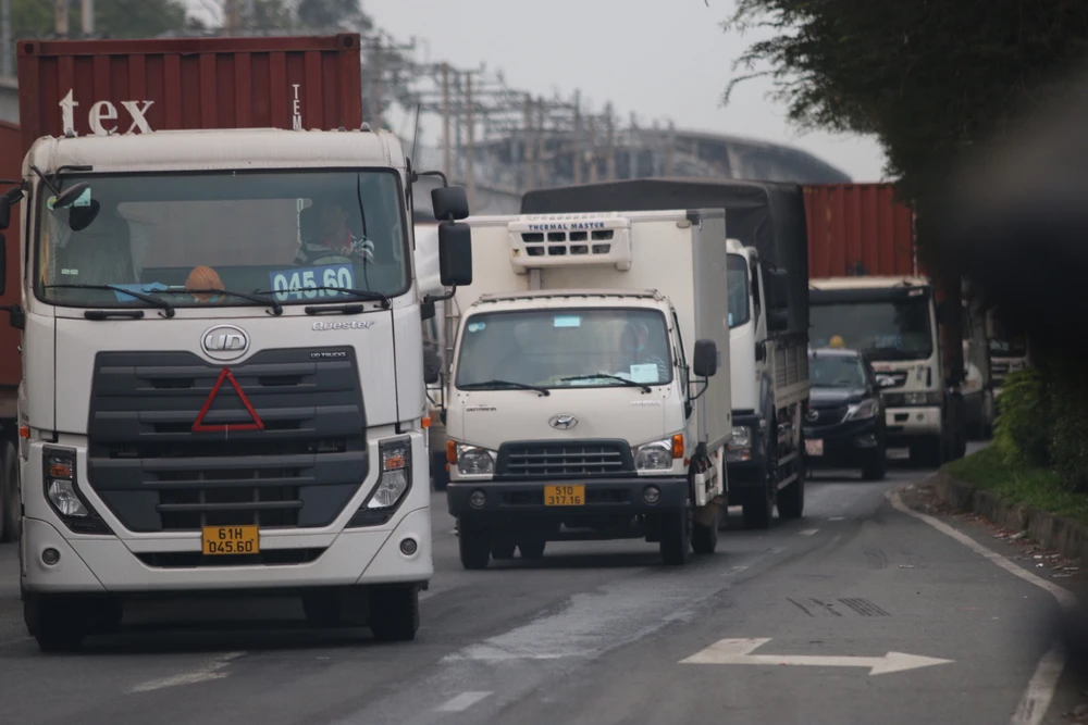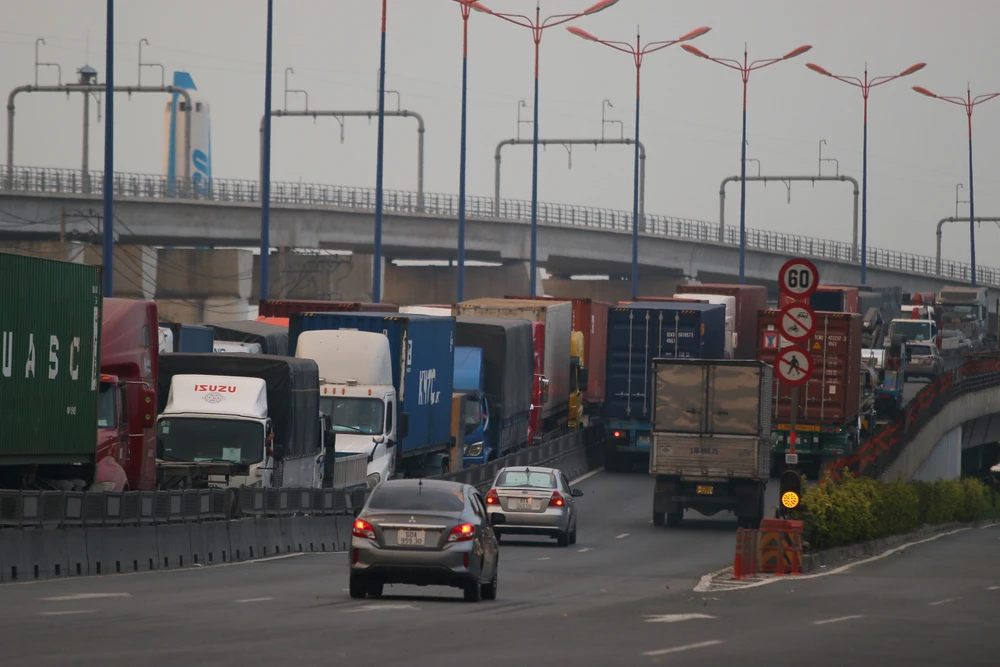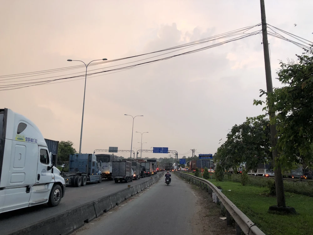 Bên cạnh đó, khu vực cầu vượt Trạm 2 (hướng về quốc lộ 1) cũng có hàng dài xe container nối đuôi nhau hàng cây số để nhích từng chút một. Nhiều xe máy phải cố gắng luồn lách từng khoảng hở để có thể đi qua đoạn kẹt này.