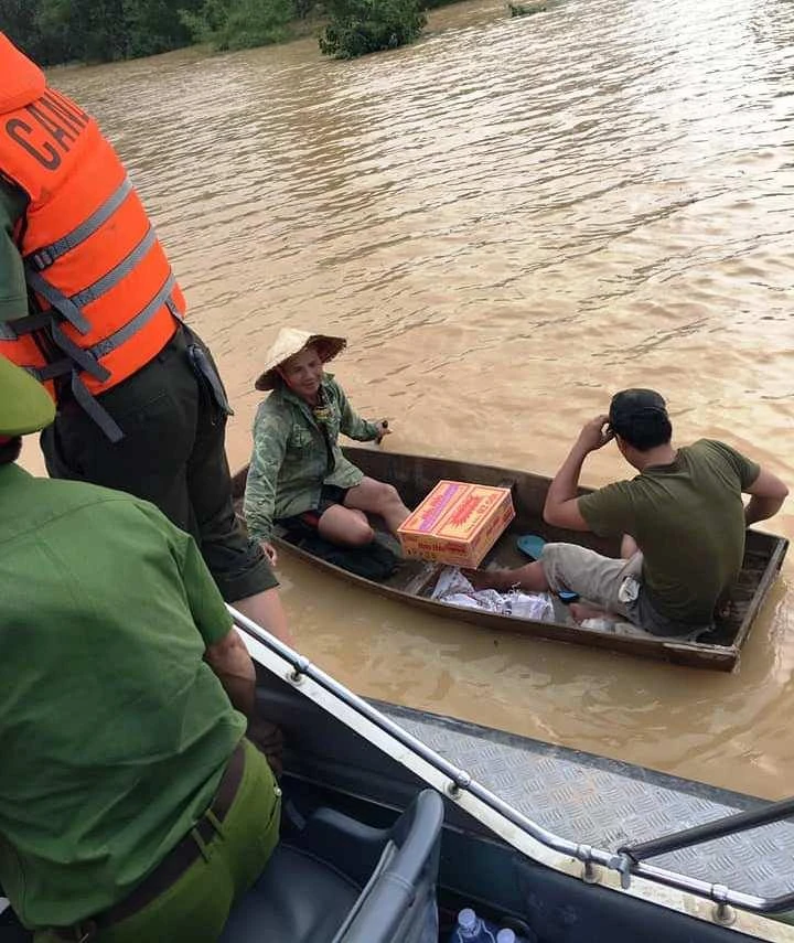 Công an huyện Hương Khê đi phát mì tôm cho các hộ gia đình đang bị cô lập trong nước lũ. Ảnh: Đậu Nhung