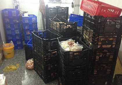 Tiếp tục kiểm tra, tổ tuần ta tìm thấy bên trong khay nhựa, túi nilong có 450 kg mỡ heo đông lạnh, hơn 2.100 kg ức gà, 215 kg thị xay, 21 kg thị heo cắt lát và 11kg da heo. Toàn bộ nguyên liệu thực phẩm này không gắn nhãn hàng thông tin xuất xứ và thời gian sử dụng. Tiếp đó, đoàn kiểm tra cũng phát hiện gần chục kg bột màu trắng xác định phụ gia chất bảo quản và làm giòn dai giò chả được sử dụng.