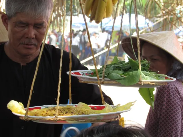 Thời tiết hôm nay khá nắng nóng. Du khách tránh nắng bằng chiếc nón đan từ lá dừa tươi tại lễ hội.