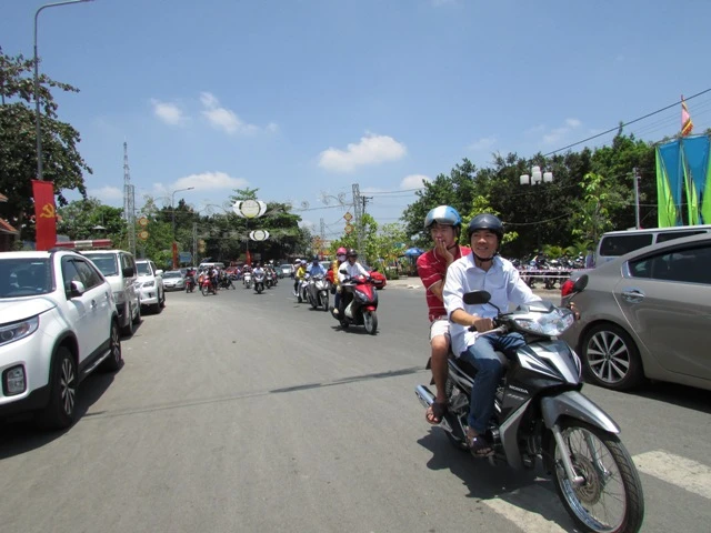 Dù trưa nắng nhưng rất nhiều xe đỗ về khu vực lễ hội, hai bên đường xe bốn bánh đậu gần kín.