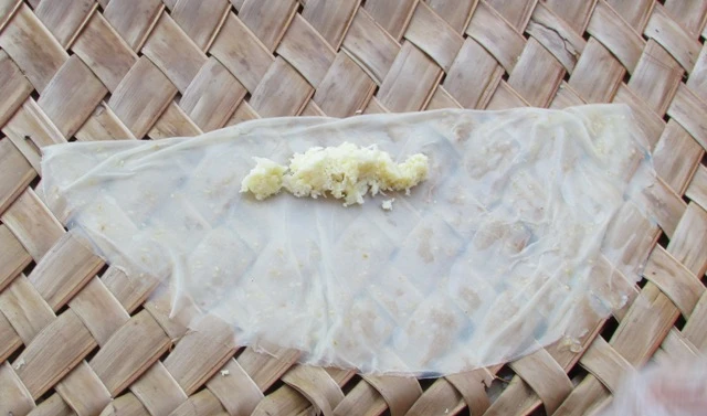 Bánh tráng chín lấy ra, bỏ nhân đậu xanh và dừa