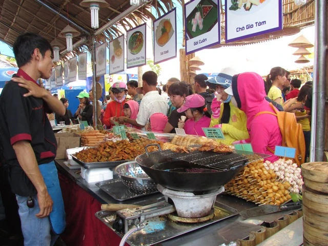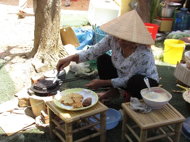 Lễ khai mạc sẽ chính thức sẽ diễn ra vào 19 giờ tối nay tại vòng xoay Cái Khế. Ảnh:Trình diễn làm bánh ngũ cốc miền Trung (gần giống bánh ống miền Nam)
