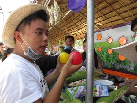 Một gian hàng bán bắp tím tổ chức trò chơi ném bóng có thưởng là những... trái bắp khiến nhiều người rất thích thú.