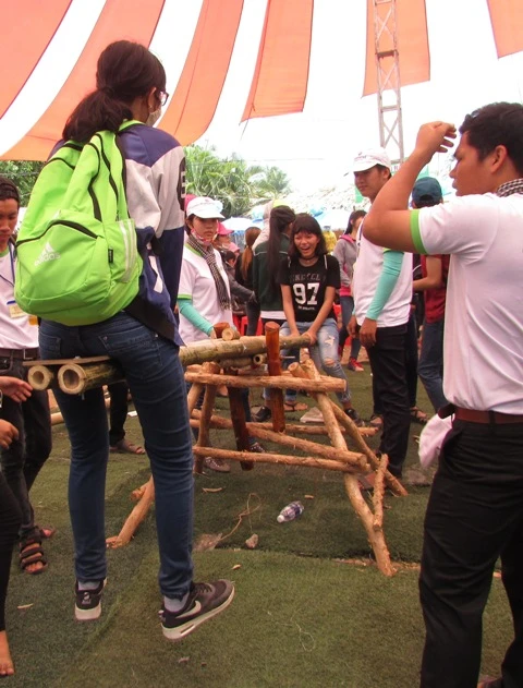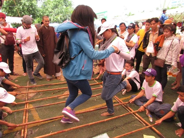 Nhiều trò chơi không chỉ thu hút bạn trẻ mà nhiều người trung tuổi cũng rất thích tham gia. Trong ảnh là chơi cầu bập bênh