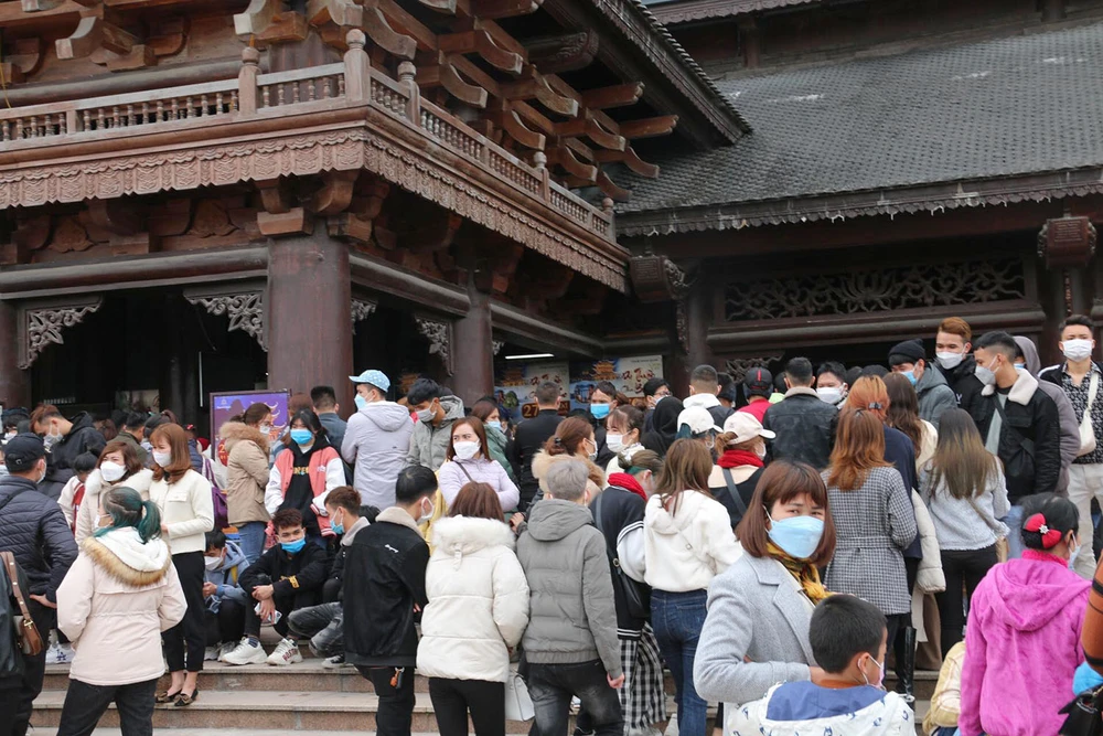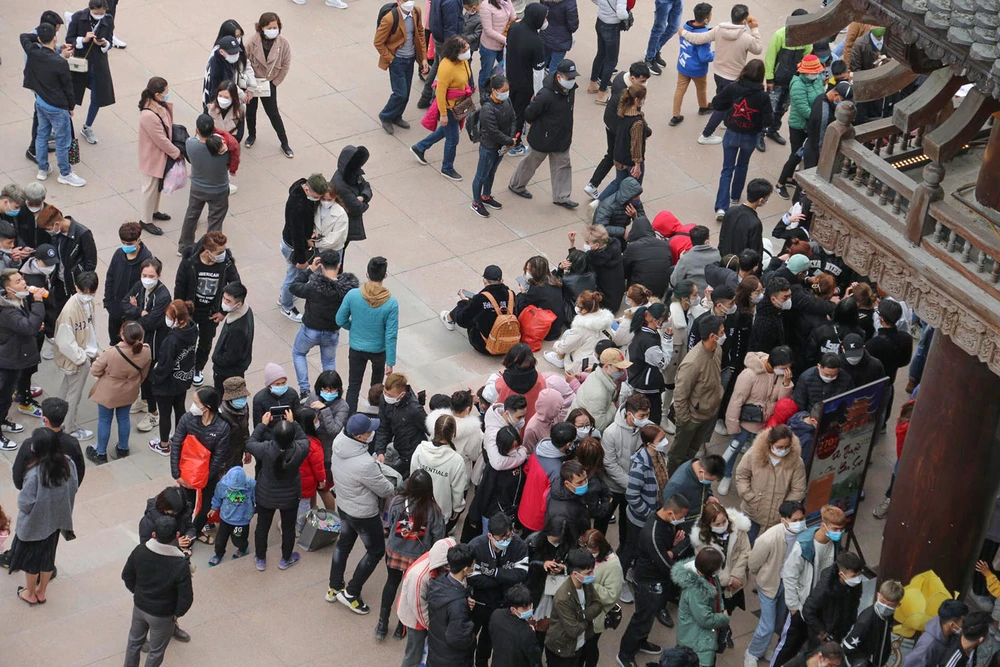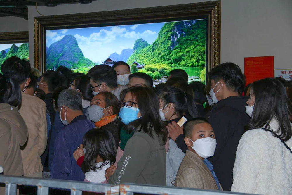 Đây là ngày thứ 3 kể từ đầu năm nơi đây mở cửa đón du khách. Đầu năm mới, nên nhiều người tranh thủ đi lễ chùa, tham quan du lịch khiến khu vực nhà chờ mua vé đông nghịt người.