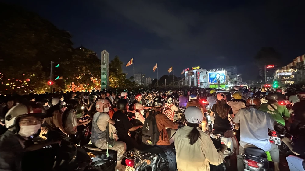 Càng về tối dòng người đổ về một đông, gây kẹt xe cục bộ trên đoạn đường đổ về chùa. Ảnh: TRẦN MINH