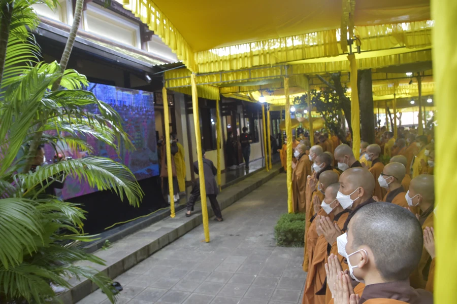 Các tăng ni, phật tử làm lễ nhập kim quan. Ảnh: NGUYỄN DO