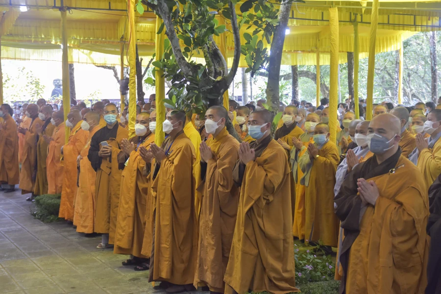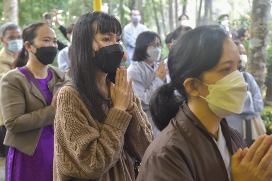 Rất đông các sư thầy, phật tử đến theo dõi lễ nhập kim quan. Ảnh: NGUYỄN DO