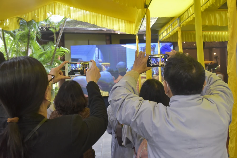 Chùa Từ Hiếu đã lắp nhiều màn hình lớn để các tăng ni, phật tử, người dân theo dõi lễ nhập kim quan. Ảnh: NGUYỄN DO