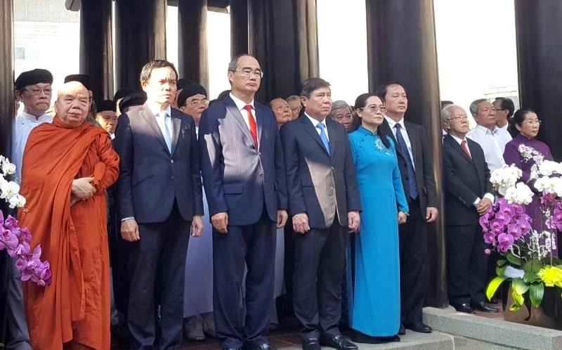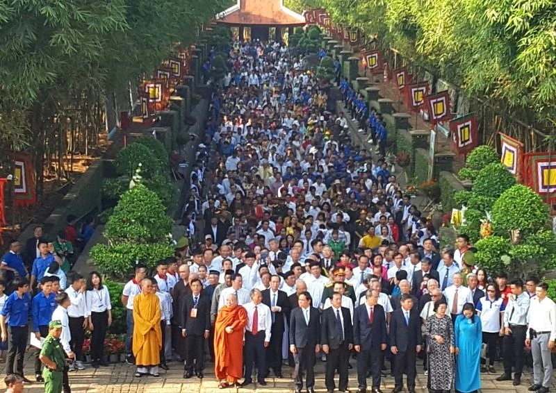 Đúng 7 giờ sáng, Bí thư Thành ủy TP.HCM Nguyễn Thiện Nhân, nguyên Bí thư Thành ủy TP.HCM Lê Thanh Hải, nguyên Phó Chủ tịch nước Trương Mỹ Hoa, Chủ tịch UBND TP Nguyễn Thành Phong cùng nhiều lãnh đạo, đại diện các ban ngành, đoàn thể và hàng ngàn người dân đã có mặt tại khu tưởng niệm các vua Hùng để dự ngày giỗ quốc tổ, nhớ về cội nguồn dân tộc.