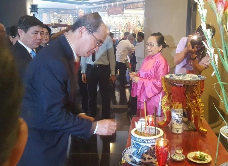 Bí thư Thành ủy TP.HCM Nguyễn Thiện Nhân và Chủ tịch UBND TP Nguyễn Thành Phong thắp hương tưởng nhớ các vua Hùng đã có công dựng nước. Ảnh: TÁ LÂM