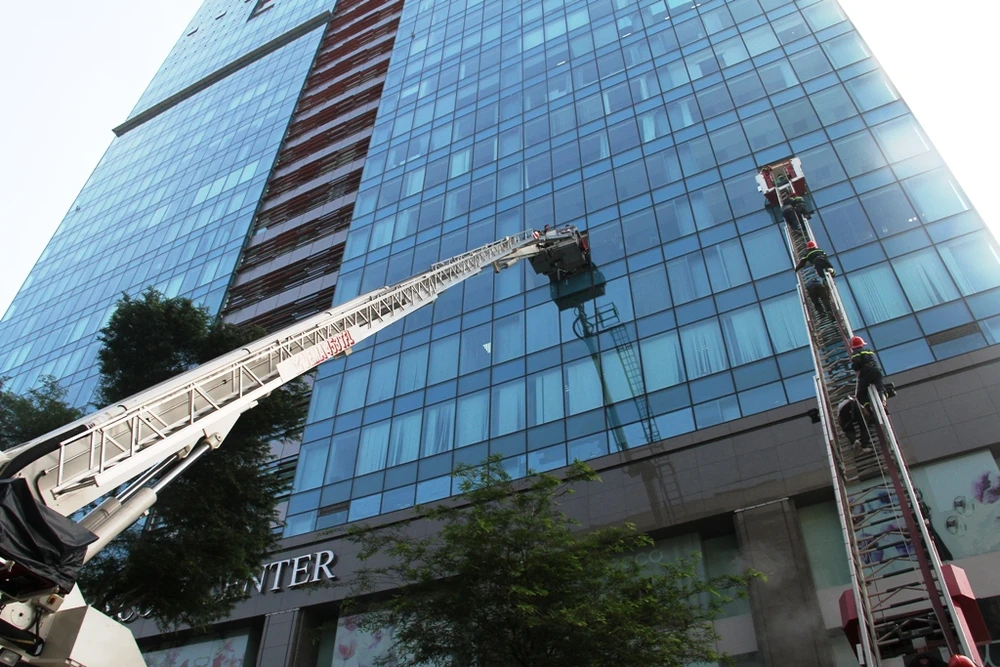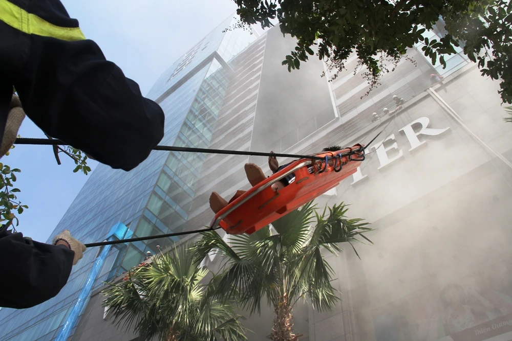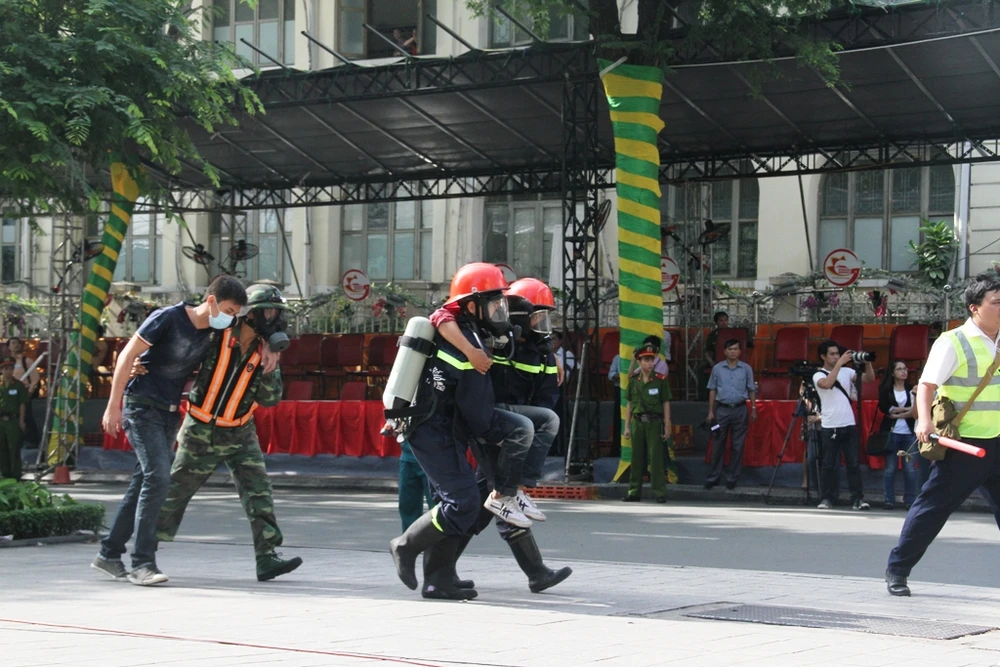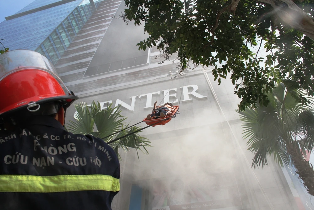 Tình huống giả định hôm nay là lúc 8 giờ tại tòa nhà Vincom Đồng Khởi cao 26 tầng (phường Bến Nghé, quận 1, TP.HCM) xảy ra sự cố cháy nổ khi đường ống dẫn gas của gian hàng phở 24 bị rò rỉ, nhân viên phục vụ bật bếp sử dụng gây ra nổ và cháy.
