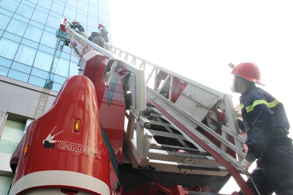 Lực lượng cảnh sát PCCC thực hiện giải cứu những người mắc kẹt trên các tầng cao.