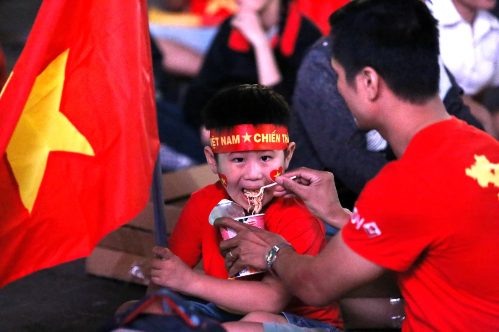 Cổ động viên nhí được bố tiếp sức bằng mì gói trước giờ bóng lăn.