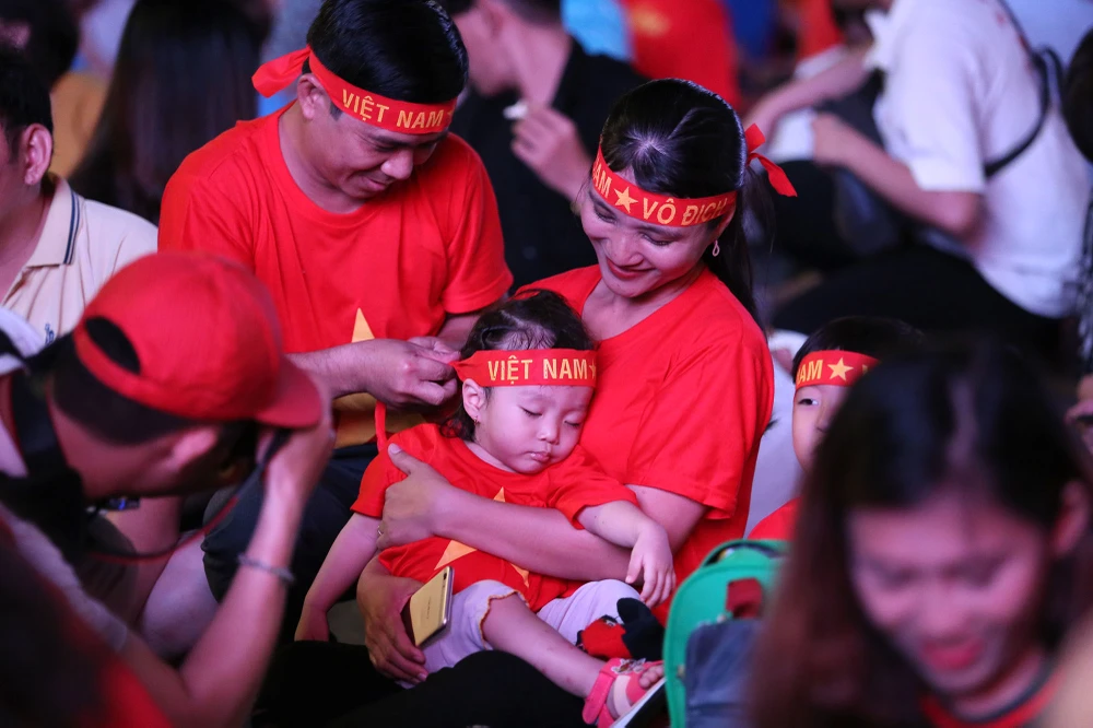 Em nhỏ được bố đeo băng rôn cổ vũ đội tuyển Việt Nam khi đang ngủ say trên tay mẹ.
