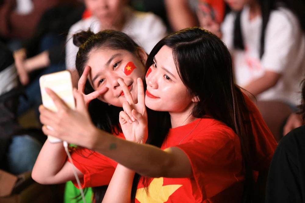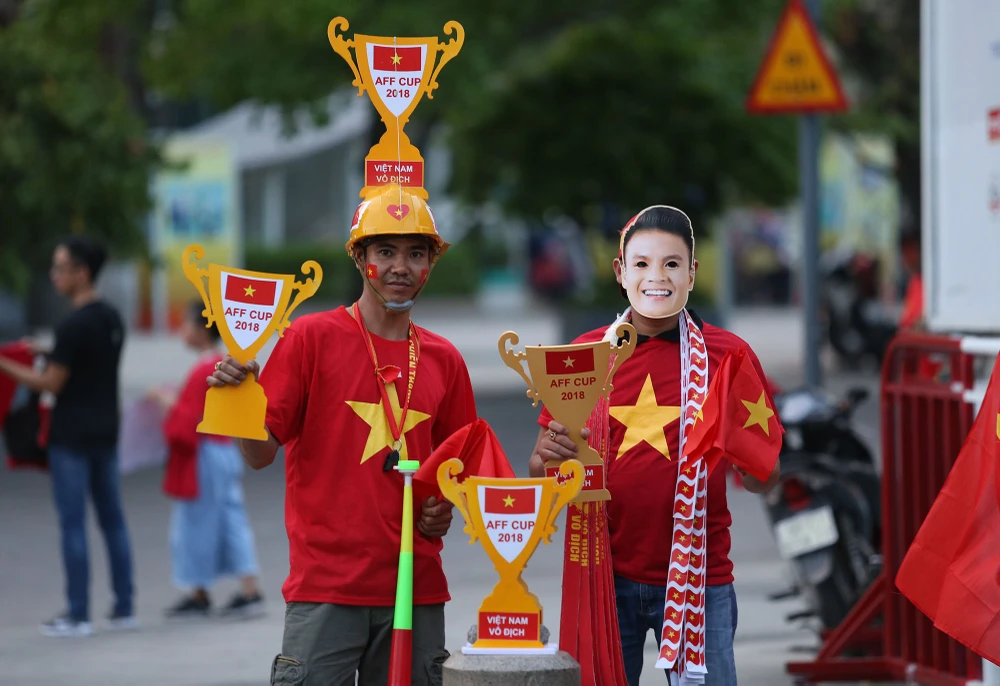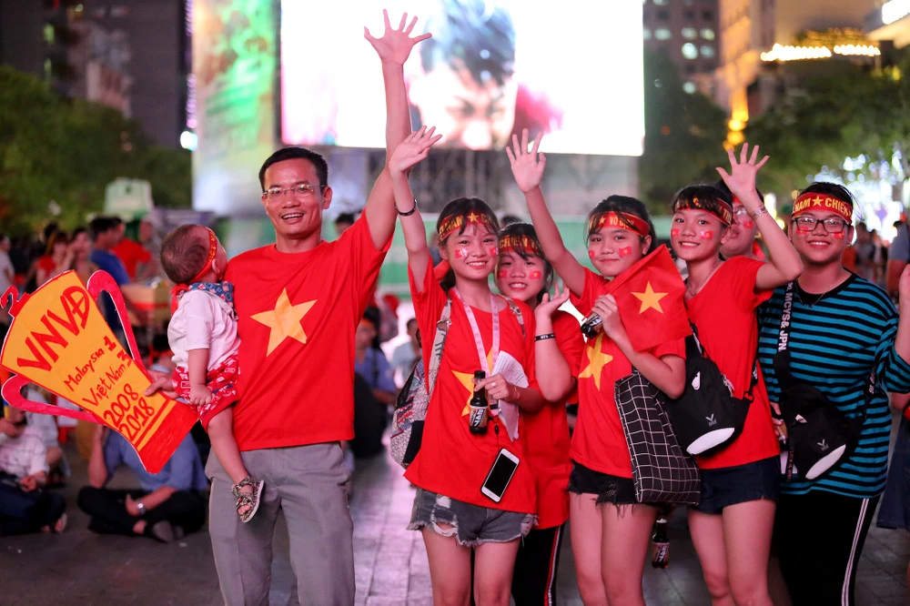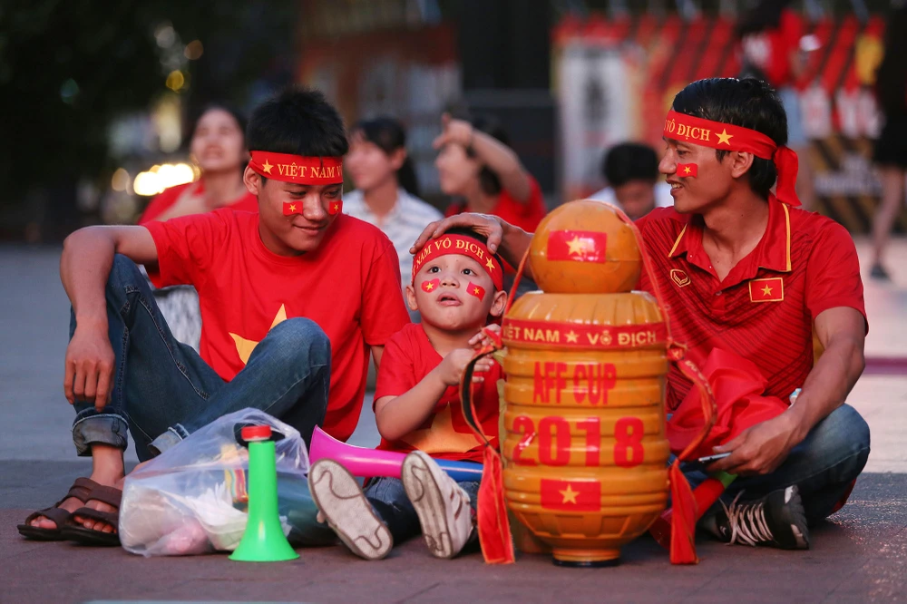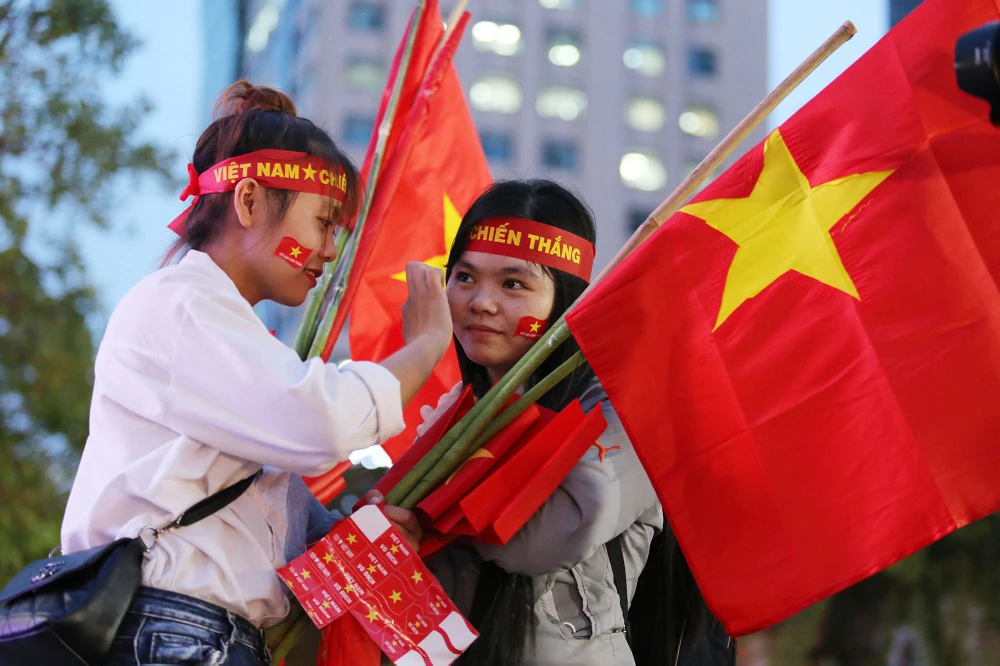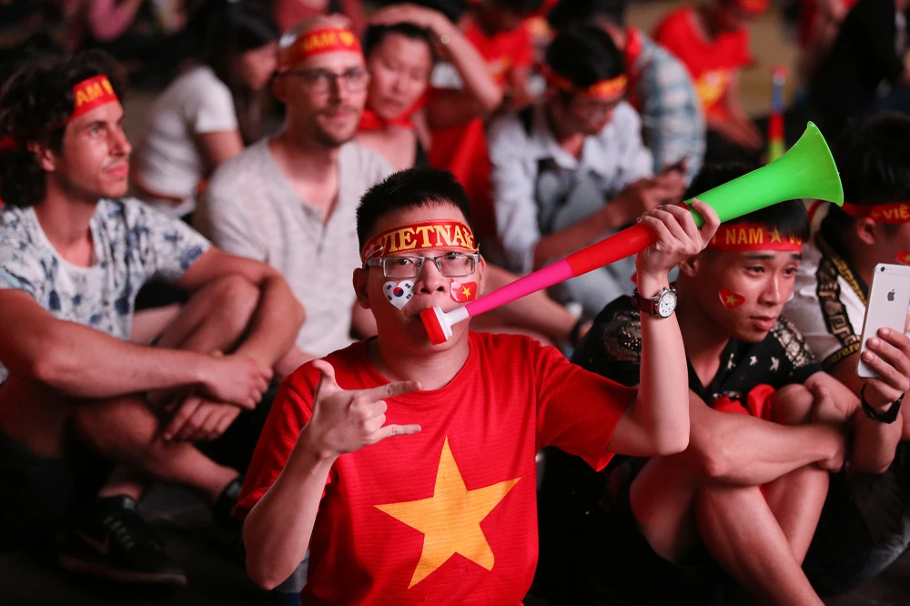 Cổ động viên hô vang "Việt Nam vô địch" khích lệ tinh thần đội tuyển thi đấu tại Malaysia.