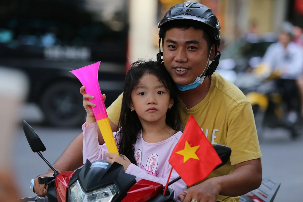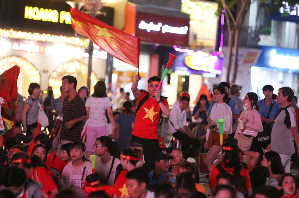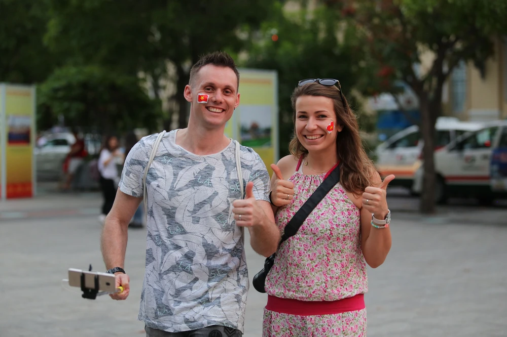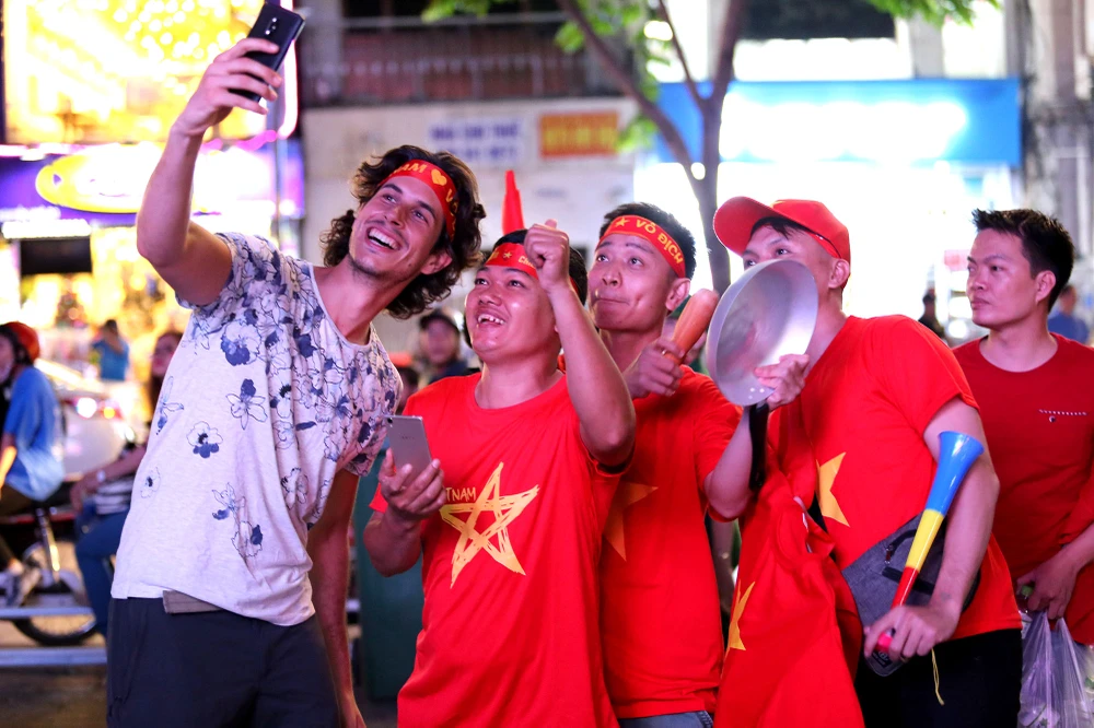 Du khách nước ngoài tại TP.HCM lên phố đi bộ cổ vũ đội tuyển VN thi đấu.