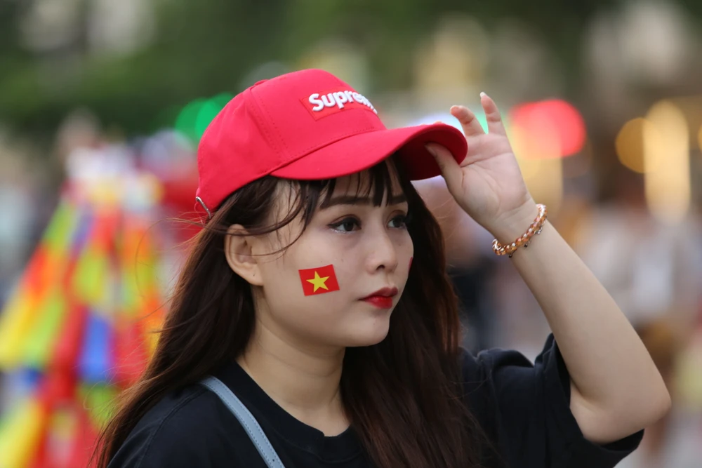 Một cổ động viên nữ dán cờ VN lên mặt đến phố đi bộ từ sớm để cổ vũ đội tuyển.