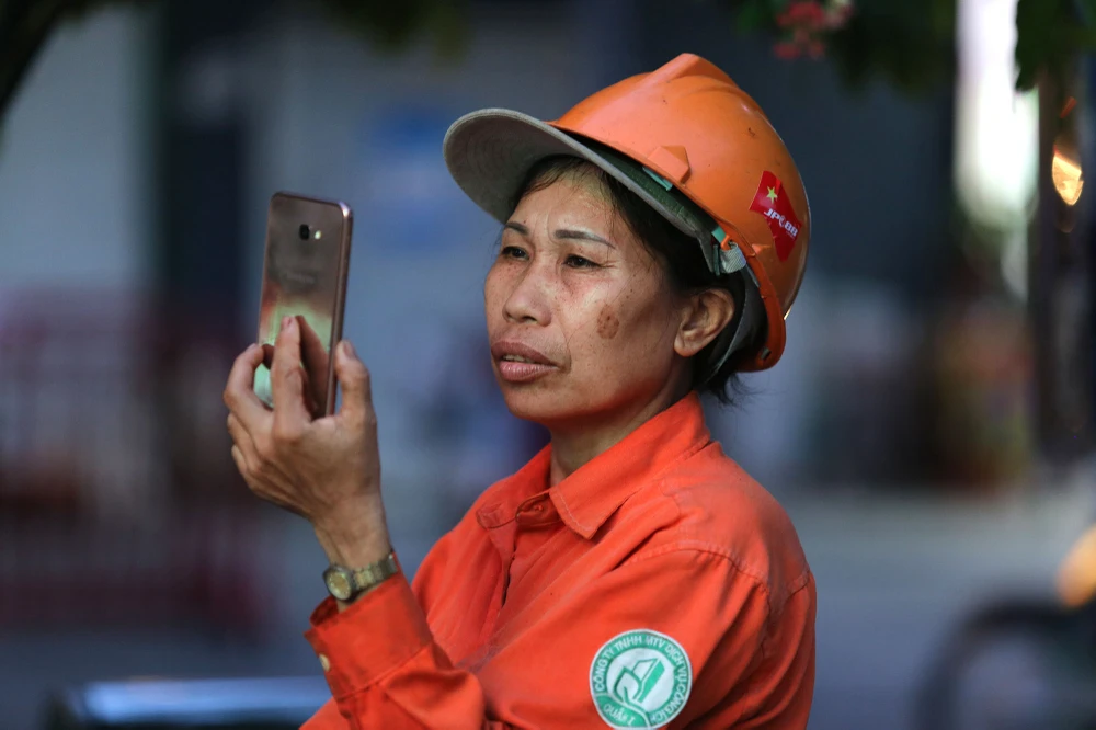 Cô Hương - công nhân dịch vụ công ích quận 1 dừng lại dùng điện thoại ghi lại hình ảnh các cầu thủ VN được chiếu qua màn hình Led.