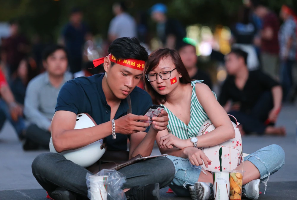 Các bạn trẻ đến phố đi bộ từ sớm để chọn vị trí thuận lợi ngồi xem trận đấu.