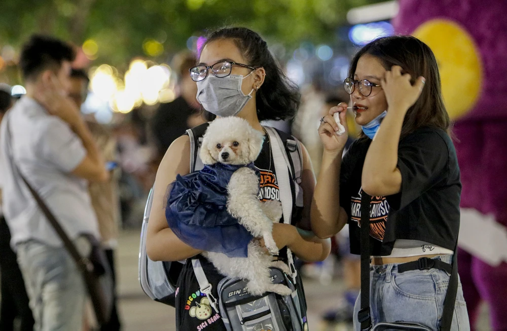 Hai bạn trẻ mang thú cưng cùng dạo phố