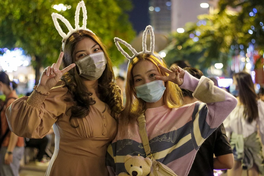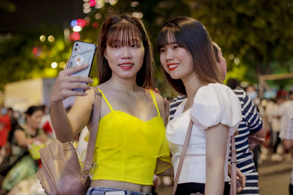 Bích Trâm (Bên phải, quận Bình Tân) có mặt ở phố đi bộ từ rất sớm để cùng bạn chụp ảnh và chờ đón giao thừa.