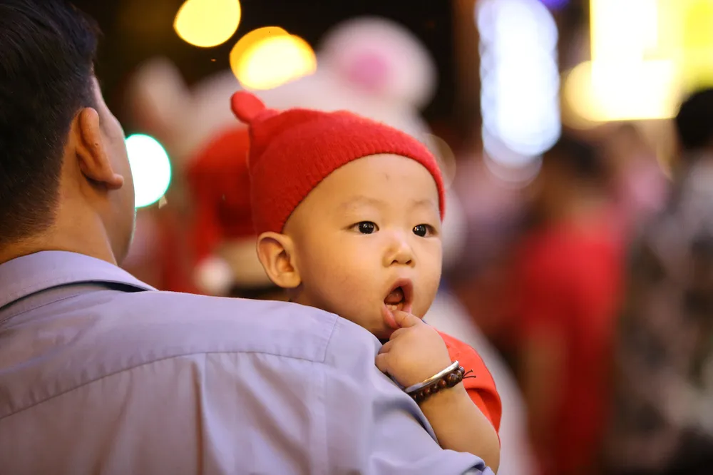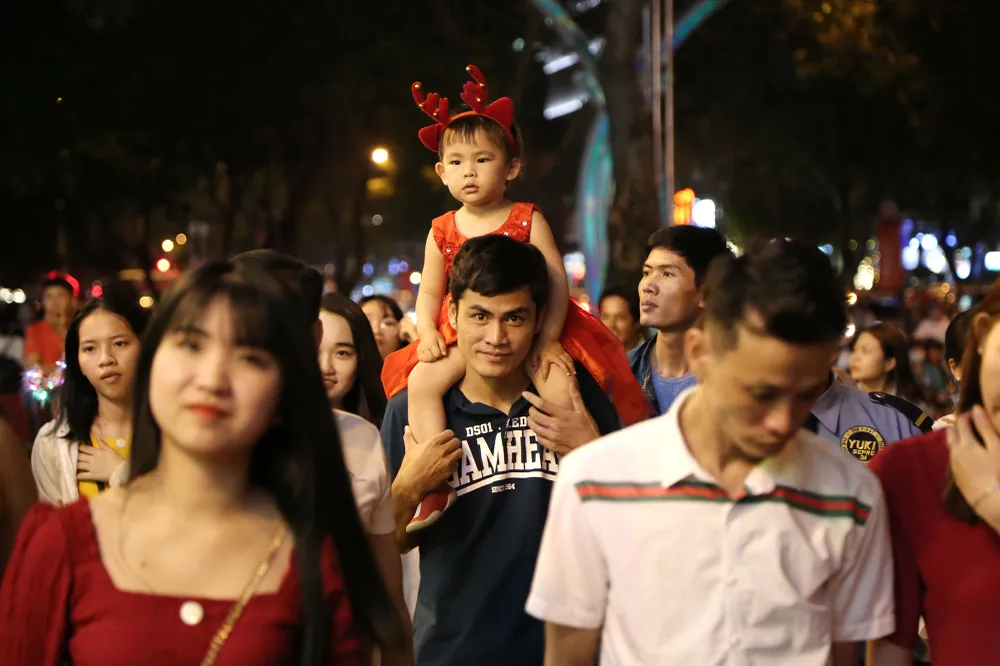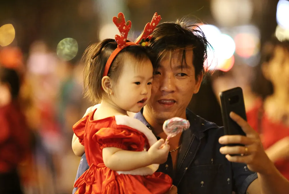 Em nhỏ được gia đình đưa xuống phố chơi Noel.