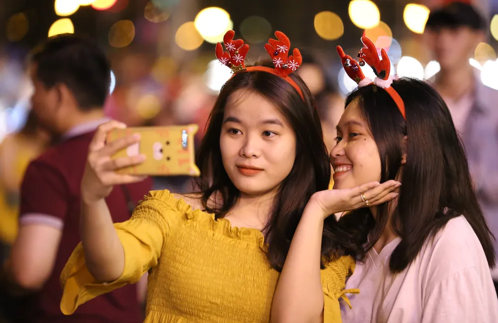 Nhóm bạn Linh diện sừng tuần lộc chụp ảnh khi đi chơi Noel.