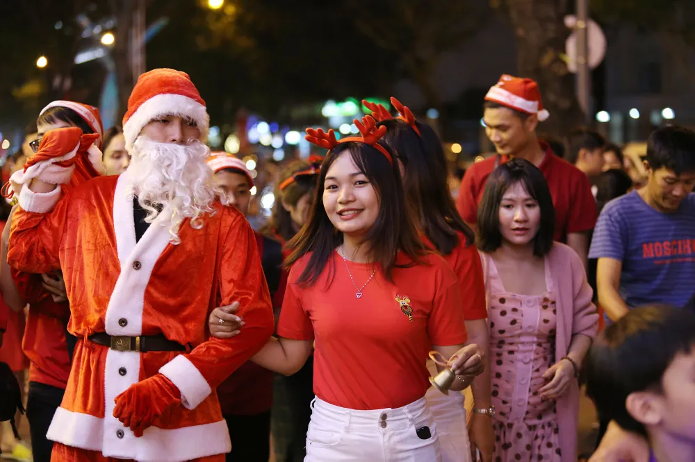 Dòng người mỗi lúc một đông, ai nấy đều tranh thủ diện các phụ kiện để xuống phố vui chơi, chụp ảnh.