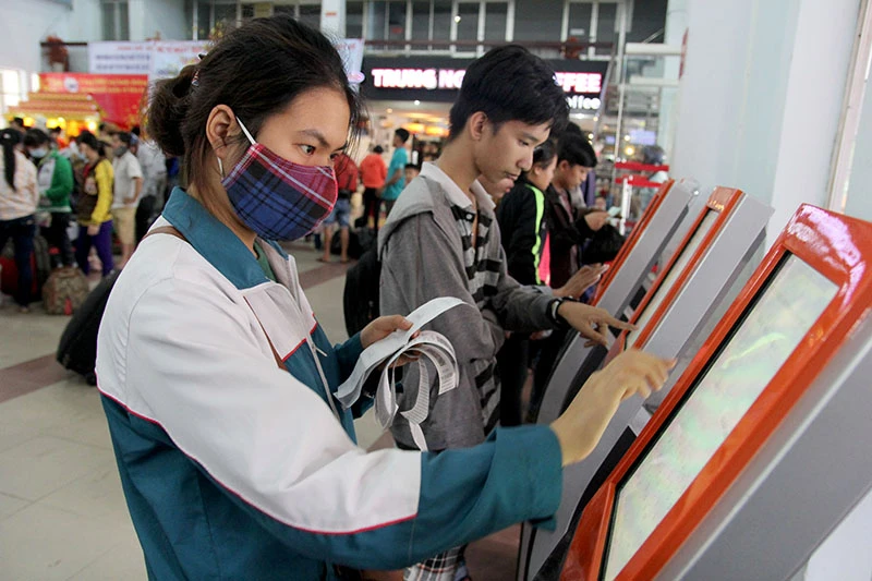 Hành khách kiểm tra lại vé tàu bằng hệ thống máy tra cứu thông tin đặt trong khu vực nhà ga. Ảnh: HOÀNG GIANG