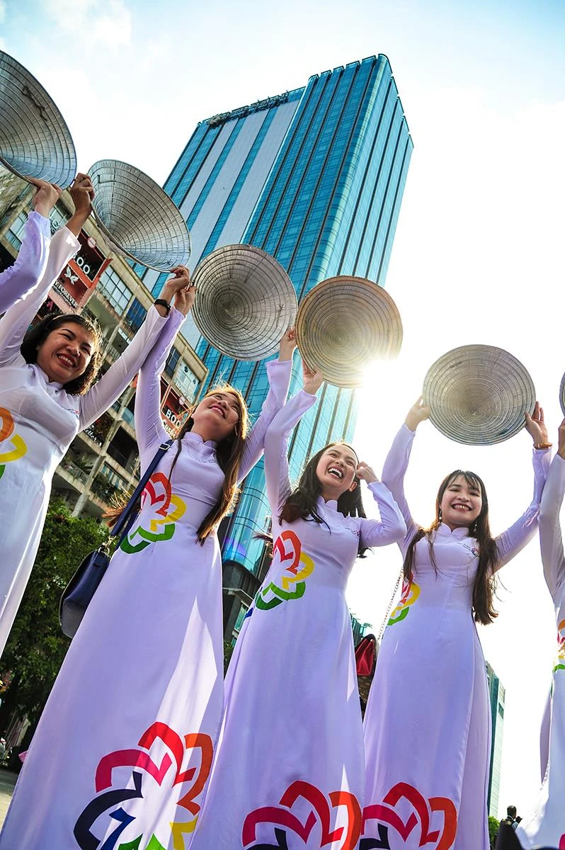 Hòa cùng các đại sứ hình ảnh là những vị khách đặc biệt như NSƯT Phi Điểu, các mẹ, các chị, cùng hàng ngàn bạn trẻ, mỗi người một vẻ, tất cả đã có màn đồng diễn áo dài mãn nhãn trên nền nhạc Mùa xuân trên thành phố Hồ Chí Minh.
