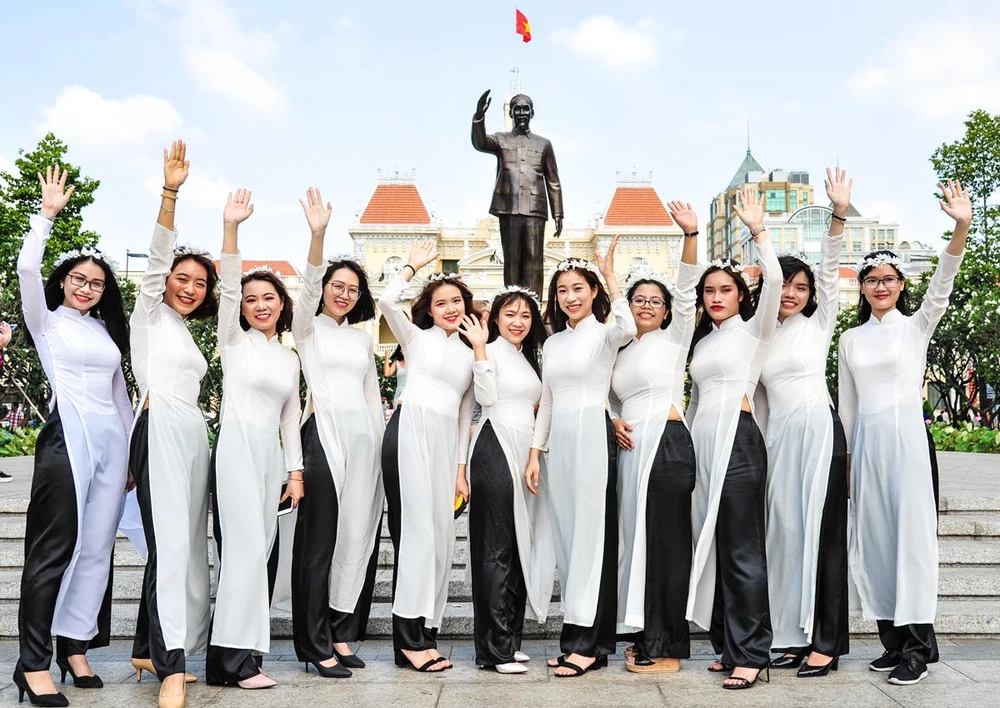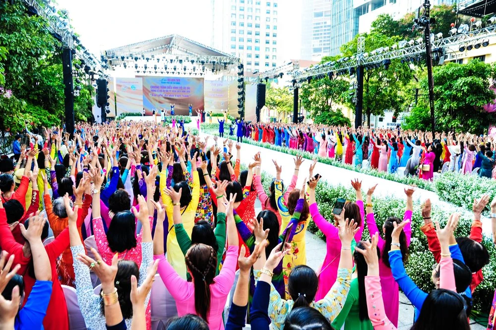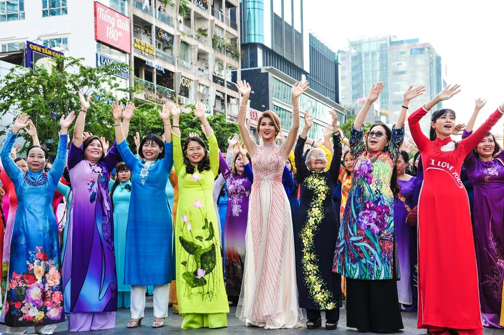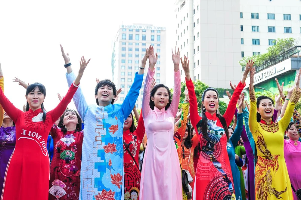 Hàng ngàn bạn trẻ có màn đồng diễn áo dài mãn nhãn trên nền nhạc Mùa xuân trên thành phố Hồ Chí Minh.