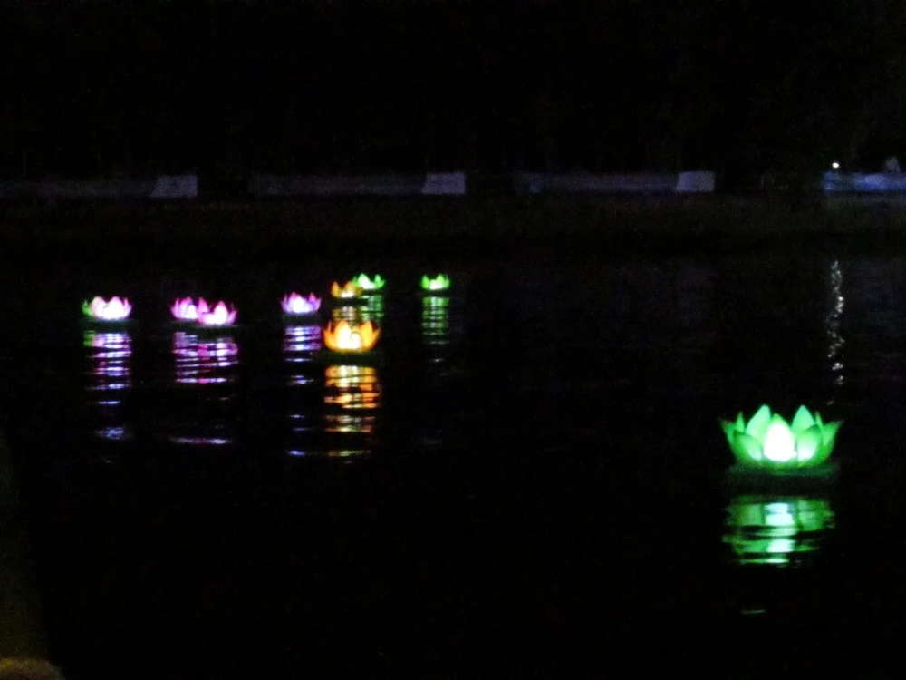 Những chiếc đèn hoa nhiều màu sắc nhưng do số lượng đèn ít nên chưa thật sự tạo nên sự rực rỡ của Đêm hoa đăng trên Rạch Khai Luông. Ảnh: NN