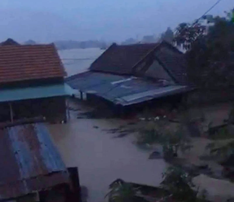 Nhiều căn nhà ở thôn Suối Cối, xã Xuân Quang 1, huyện Đồng Xuân, Phú Yên chìm trong lũ. Ảnh: THU TRINH