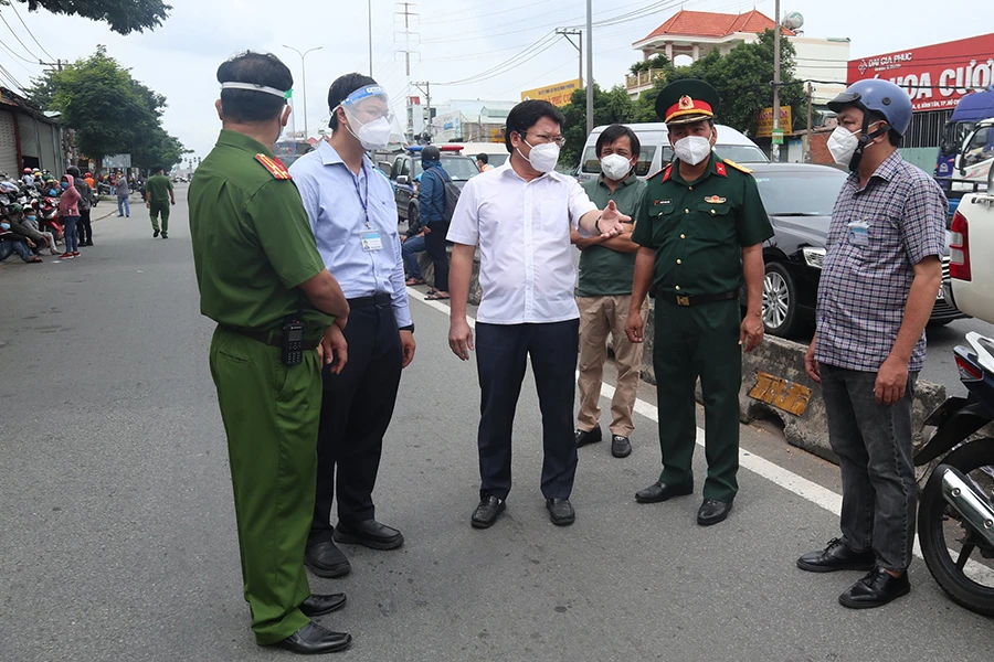 Ông Lê Văn Thinh, Bí thư quận Bình Tân,có mặt tại chốt kiểm dịch chỉ đạo, vận động bà con trở lại nơi cư trú ở TP.HCM. Ảnh: N.TÂN