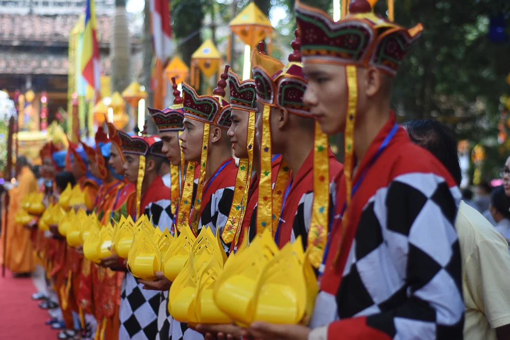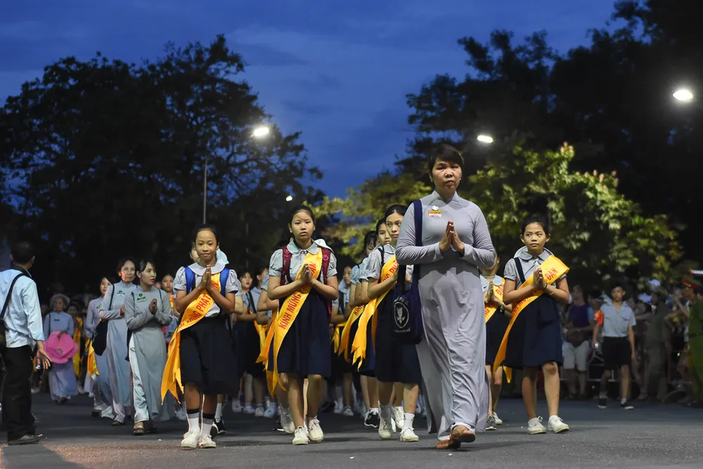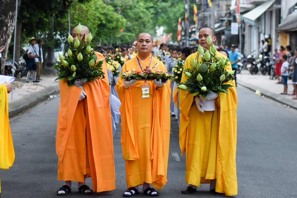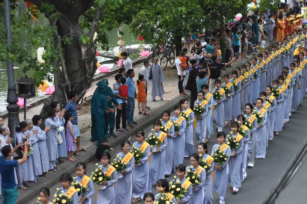 Sau lễ Mộc Dục, hàng ngàn tăng ni, Phật tử tiến hành lễ rước Phật từ quốc tự Diệu Đế đến tổ đình Từ Đàm.