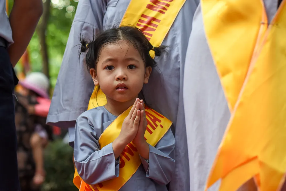 Tham gia đoàn rước Phật có rất đông các em nhỏ.