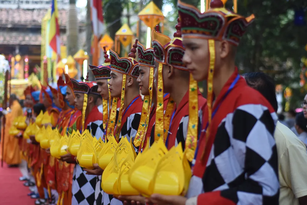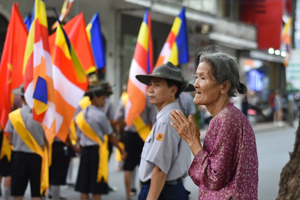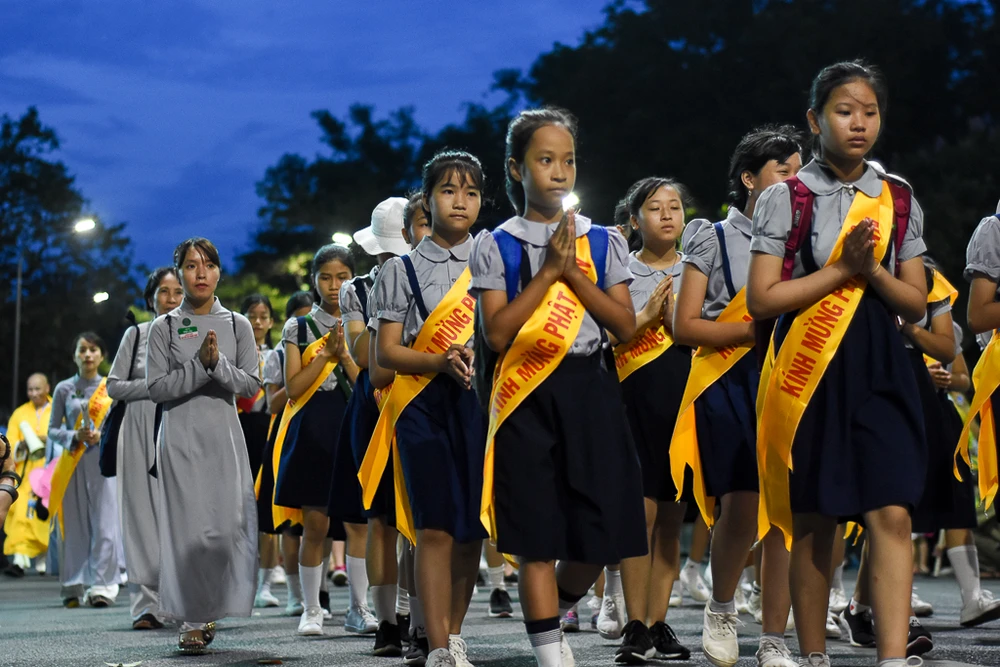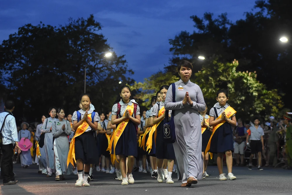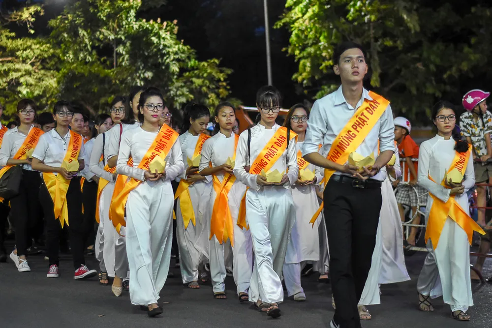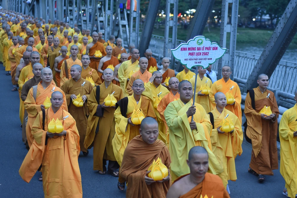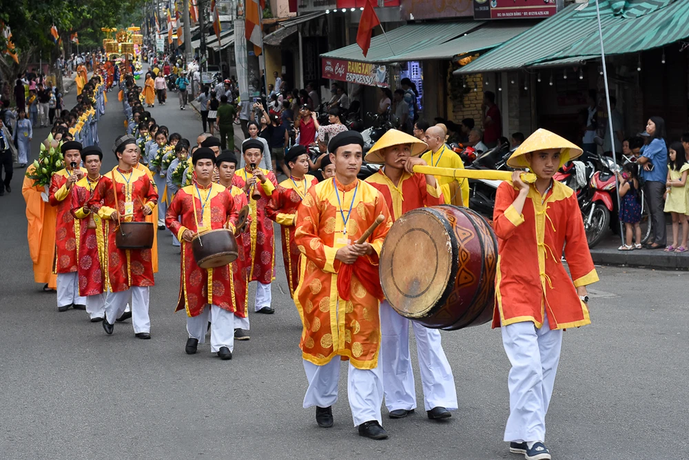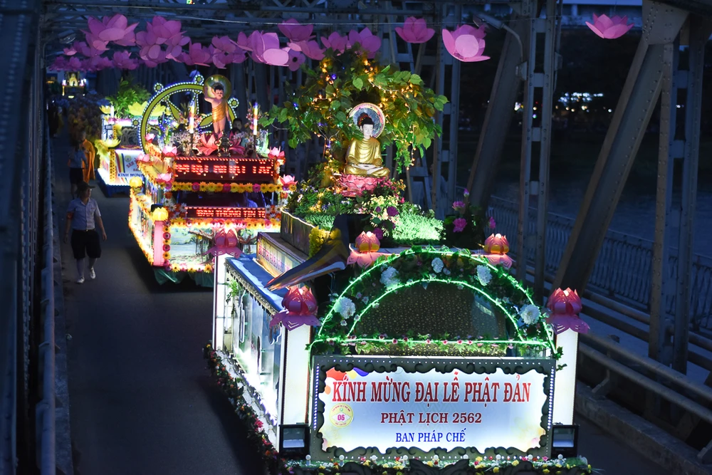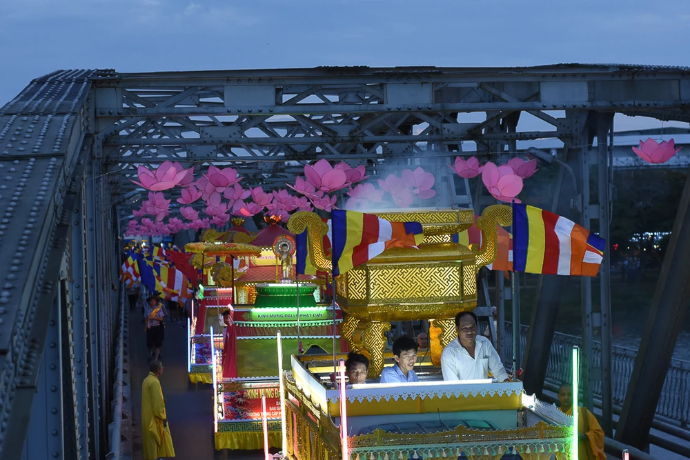 Đoàn rước Phật trên đường đến chùa Từ Đàm. Tại chùa Từ Đàm, vào sáng mai 29-5 (15-4 âm lịch) sẽ diễn ra chương trình chính thức của đại lễ Phật đản Phật lịch 2562.