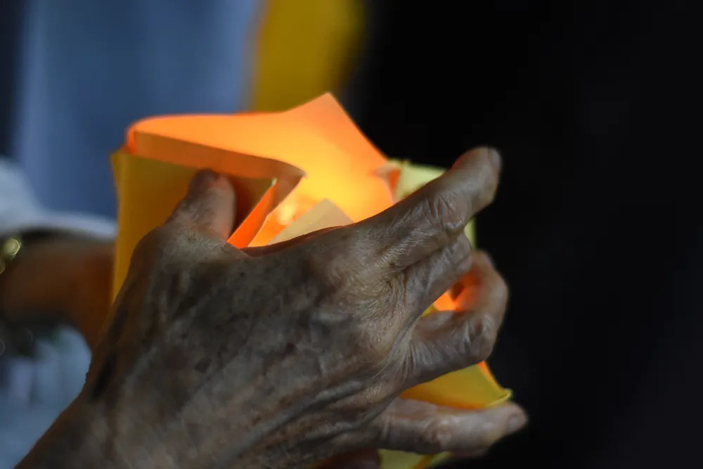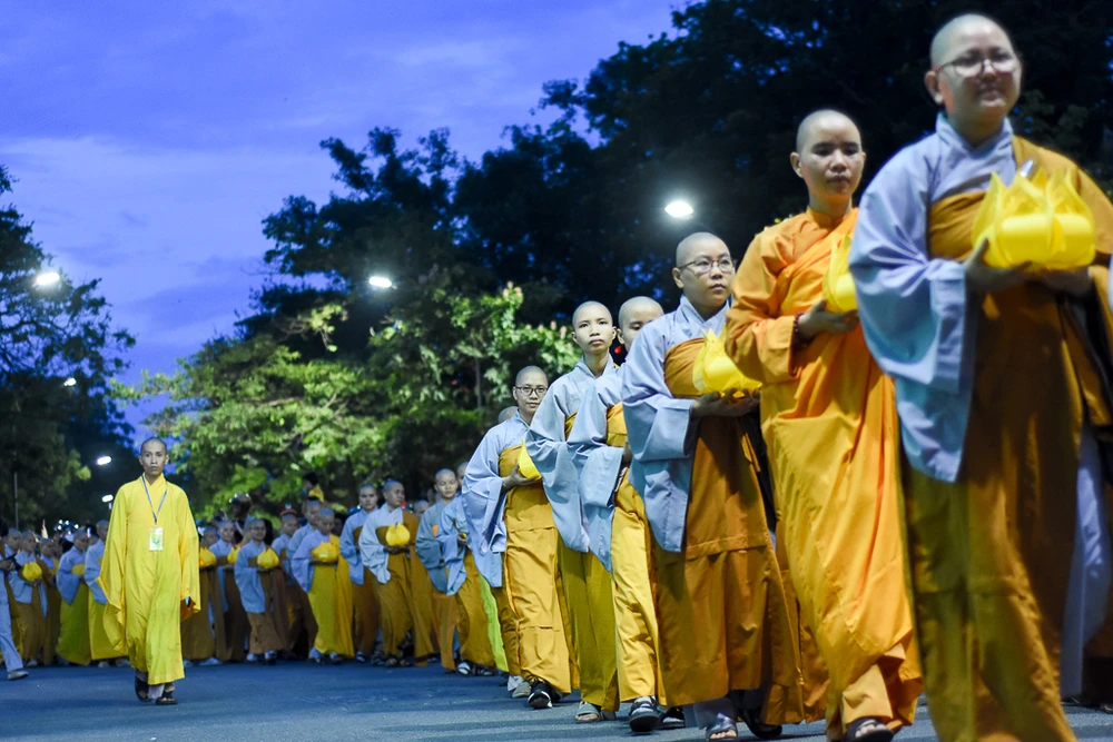 Đường đi dài, các tăng ni, Phật tử dùng tay che gió để những ngọn nến được thắp sáng xuyên suốt dọc đường đi.