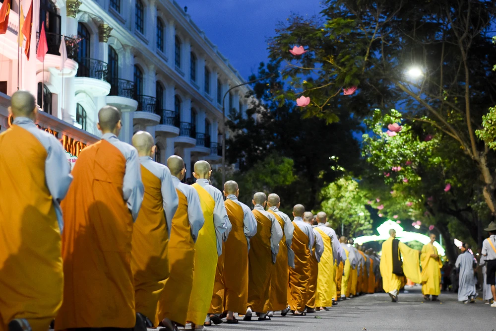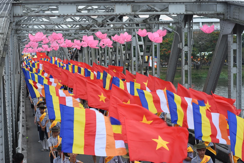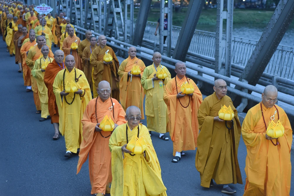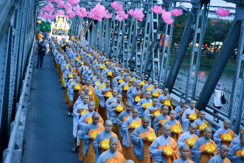 Khác với năm trước, năm nay đoàn rước Phật đi bộ qua một số tuyến đường và cầu Trường Tiền.