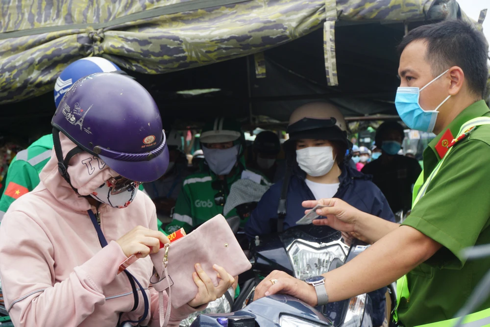 Người dân được kiểm tra giấy tờ cá nhân, đo thân nhiệt và giấy xác nhận của công ty đi làm.