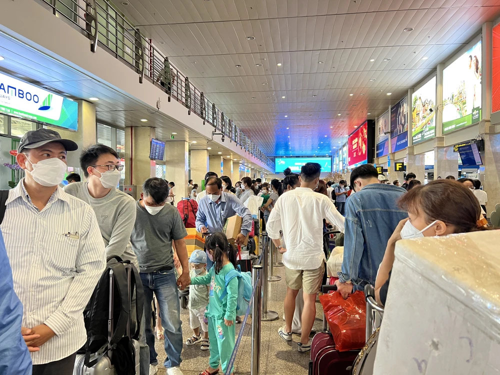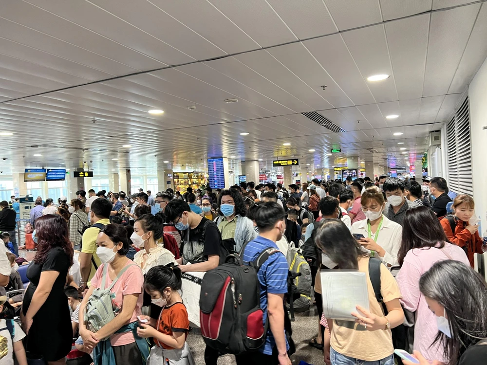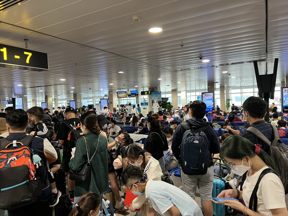 Phía trên phòng chờ sân bay Tân Sơn Nhất cũng đông nghịt khách. Hành khách không có chỗ ngồi. Thậm chí phải đứng và không ít người ngồi bệt xuống sàn.