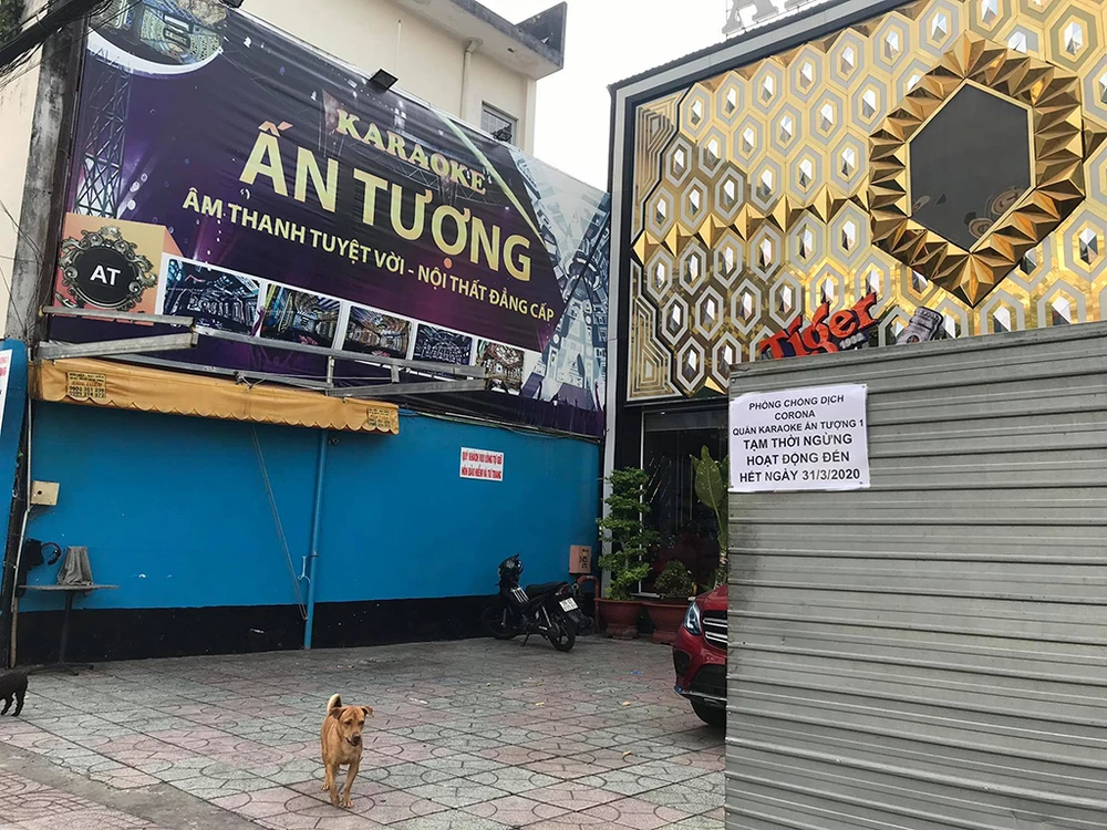 Karaoke Ấn Tượng, một trong những điểm giải trí lớn nhất quận với lượng khách lớn đã đóng cửa kèm thông báo quán ngưng hoạt động đến 31-3. Ảnh: Nguyễn Thi