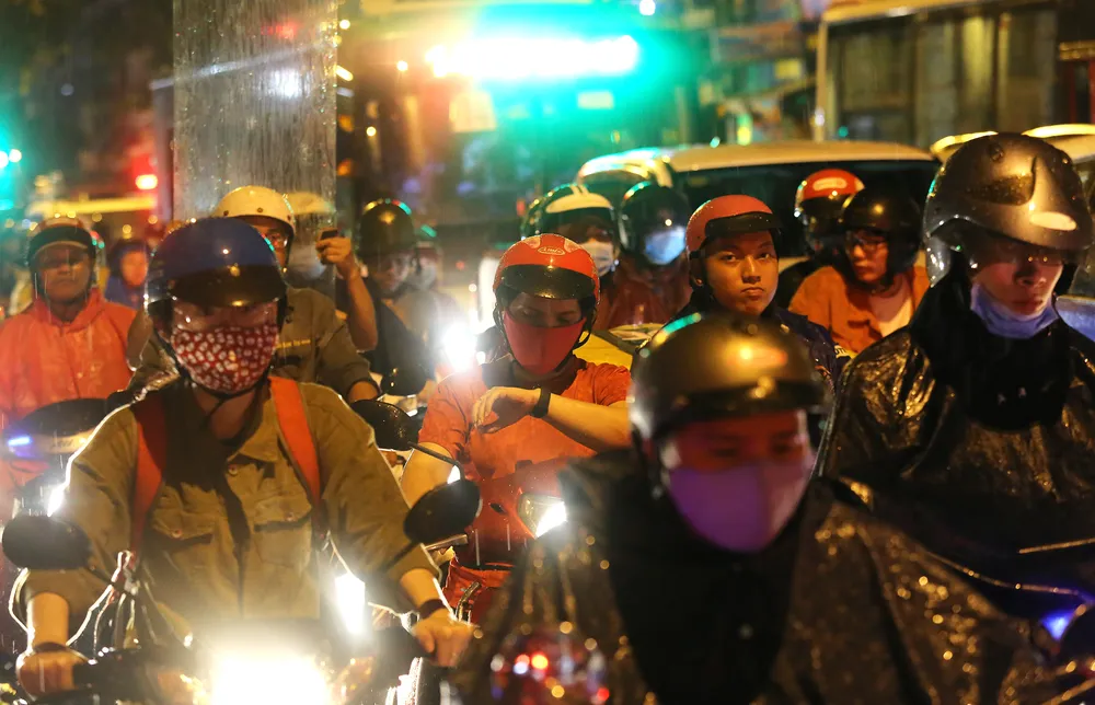 Hai mẹ con ở quận quận Bình Thạnh mệt mỏi trong dòng xe cộ đông đúc sau mưa lớn.