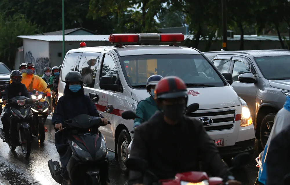 Xe cấp cứu chật vật xin đường để di chuyển qua khu vực.