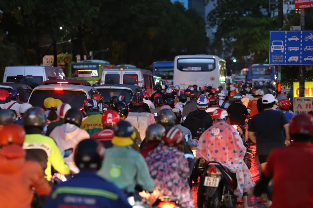 Hàng ngàn phương tiện nối đuôi nhau di chuyển.
